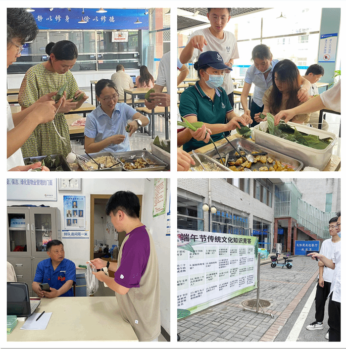 在后勤管理处的大力支持下,同学们亲身参与包粽子活动,经验丰富的老师耐心指导同学们包棕子技巧,挑选粽叶、添加馅料、棉线一绕、一捆,是一步步的技巧、一个个饱满的粽子,更是饱含温暖的一餐一饭。美味的粽子新鲜出炉,同学们在品尝着粽子的同时,也将粽子分享给公司各行各业的工作者们,让粽叶的清香味飘满整个校园。