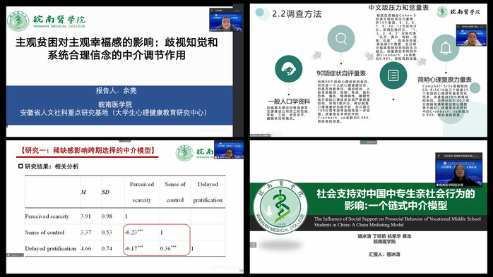 会议共设置了“社会心理学价值观研究带来的启示”的8场主旨演讲,“心理健康课与社会心理服务体系建设的结合”等35个专题报告,“心理咨询与治疗”等45场分组报告以及两个卫星会议。公司心理学团队应邀在会上作题为“Impact of Subjective Poverty on Intertemporal Choice: The Mediating Role of Sense of Control”、“主观贫困对平和心态的影响:歧视知觉和系统合理信念的中介调节作用”、“某交通建设公司员工心理健康现状及其影响因素的研究”和“The Influence of Social Support on Prosocial Behavior of Vocational Middle School Students in China: A Chain Mediating Model”的学术报告,与来自中国社会科公司、北京大学、北京师范大学、南开大学和南京大学等众多高校的专家学者、研究人员、一线教师们济济一堂,共同交流与分享社会心理学理论及实践的成果。