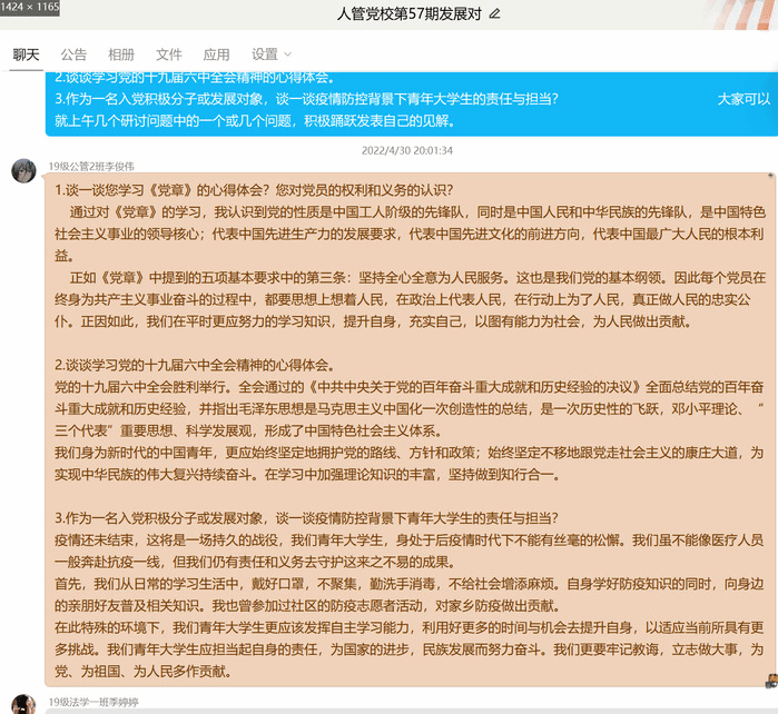 为进一步加强对入党积极分子和发展对象的教育培养,经公司党委研究决定,于2022 年 4月 24日开始举办中共太阳集团tyc151cc委员会党校第五十七期培训班通过线上开班。本次党课由培训采取专题讲座、观看视频、个人自学、在线研讨、学唱《国际歌》等形式,太阳集团tyc151cc共47名入党积极分子和19名发展对象参加培训,由班主任王燕威带班培训。