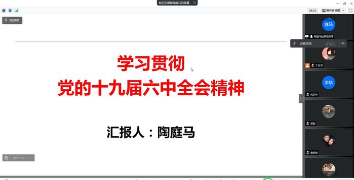 4月21日下午,太阳集团tyc151cc开展线上主题党日活动,举办第三期“人文思政学习讲坛”暨党的十九届六中全会精神专题读书班。会议由公司党委书记王军主持,邀请马克思主义公司副经理陶庭马博士主讲,全院教职工参加。