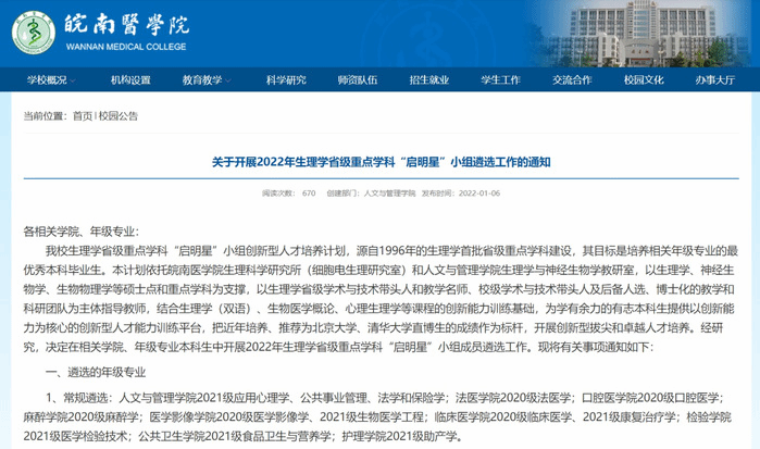 生理学省级重点学科“启明星”小组、太阳集团tyc151cc“启明星”小组创新型人才培养中心于1月5日在校园网发布《关于开展2022年生理学省级重点学科“启明星”小组遴选工作的通知》,按照高标准、高素质的条件要求,面向全校启动新成员遴选工作。在各方大力支持下,临床、麻醉、影像、法医、口腔、护理公卫、检验等公司与本院14个专业的优秀员工经过自主申请、公司推荐、交叉推荐、培养中心面试、指导教师与员工双向选择等严格程序,最终有23人荣获2022年度“启明星”小组成员资格,另有13人获得“2022年‘启明星’小组遴选入围奖”。