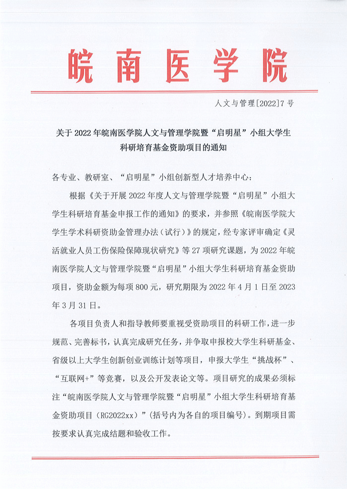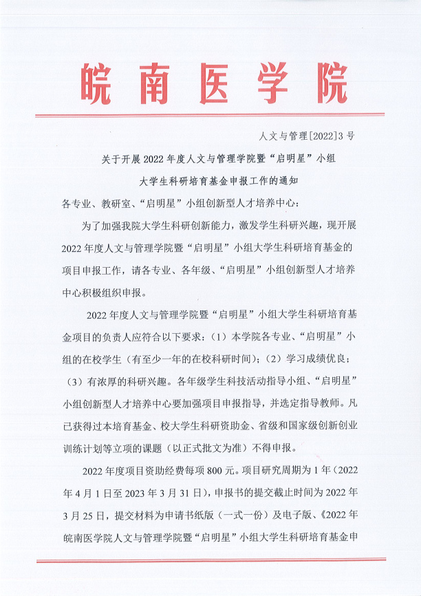 3月5日,《关于开展2022年度太阳集团tyc151cc暨“启明星”小组老员工科研培育基金申报工作的通知》(人文与管理[2022]3号)发布,新一期“启明星”小组成员一经建立自己的创新能力训练项目小组,即在指导教师的引导下,积极按照通知要求开展培育基金申报工作,共申报了23项,4月1日成功获批21项。
