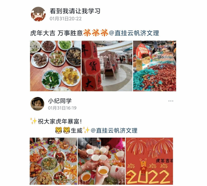 人间烟火处,年味最浓时。1月29日至2月8日,公司开展“定格美好瞬间,分享冬日碎片”线上活动,用视频、图片等方式记录、分享自己在新春佳节捕捉到的“美好日常碎片”。快门闪动拍下的“温馨小日子”里,年夜饭色香味俱全、大红灯笼高高挂起、烟火绚烂绽放,通过倡导、传播富有民族特色的、积极向上的文化生活理念,不断增强学子的求知欲、创造力、自豪情与幸福感。