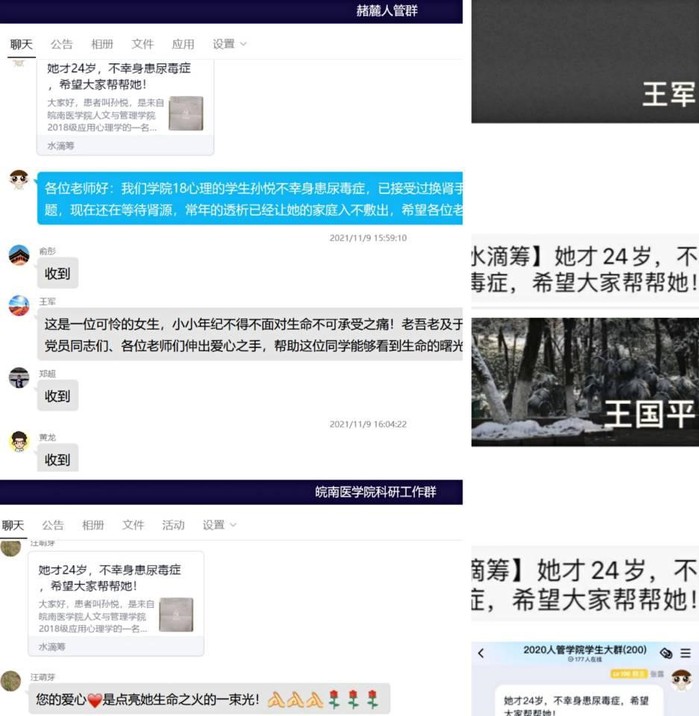 11月上旬,在得知孙悦同学的病情后,在公司党委的领导下,院团委在线上发起水滴筹,并通过QQ工作群、QQ空间、微信朋友圈等网络新媒体进行积极转发,爱心接力棒在全体皖医人群中迅速传递。