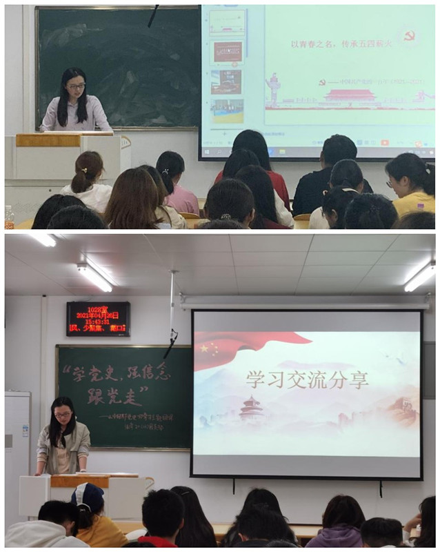 4月19日,保险19(01)班团支部以“学习党史,展望今朝”为主题,对建党一百周年以来所走过的风雨征程和光辉历史进行了回顾,团委员工副书记乔迈参加团支部学习交流,鼓励同学们“不忘初心、牢记使命”,在新的时代紧跟党的伟大步伐,创造美好未来。4月23日,心理19(01)、心理19(02)团支部组织团员青年开展“学党史、强信念、跟党走”主题团日活动,乔迈以“新民主主义革命”为主题,带领同学们对新民主主义革命的历史背景和具体的革命历程进行了回顾,让同学们牢记历史的同时发扬先辈们的精神,在学习和工作中敢于面对艰险、迎难而上。