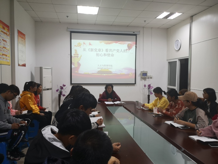 人文与管理公司党委书记窦弘以“从《新党章》看共产党人的初心和使命”为专题,以“新党章学习”为教学核心,为入党积极分子授课。她在课上着重强调:各位同学要牢记自己积极要求加入党员队伍的初心,端正入党动机,始终保持着高度自觉,在学习和生活中保持着批评与自我批评的态度。在课上,窦弘书记以事实举例,帮助积极分子理解,并勇于承担起党员的责任与使命。