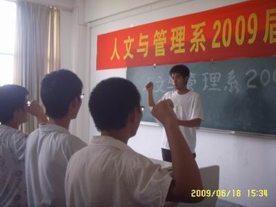 为迎接即将到来的期末考试,6月18日下午,人文与管理系08级全体员工干部在东306开展了以“诚信做人、诚信考试”为主题的考前宣誓活动,08级辅导员吴映辉老师主持了本次活动。