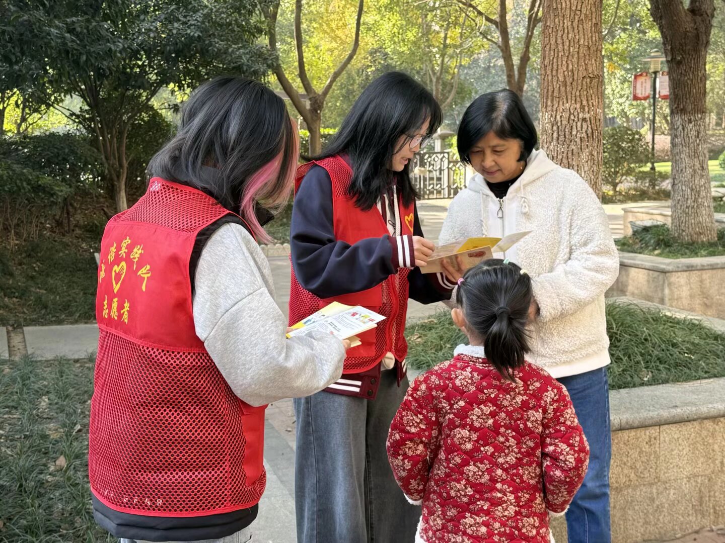 此外,实践队成员深入社区周边,向居民发放《中华人民共和国妇女权益保障法》《中华人民共和国反家庭暴力法》宣传手册,结合手册内容解读法律条款中家庭保护的核心要点,同时博谘成员在社区广场为家庭讲解反家庭暴力知识,实现了“儿童 + 家长”的双向宣传覆盖。