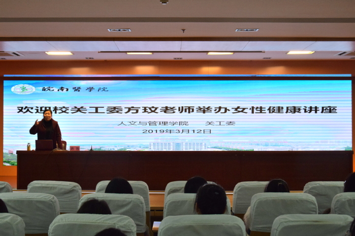 为更好的关爱女性健康,提高女老员工对个人健康安全的认识,3月12日晚六点三十分,太阳集团tyc151cc联合校关工委在图书馆三楼报告厅举办了女性健康讲座,校关工委老师方玟担任主讲人,太阳集团tyc151cc辅导员訾梦婷,2017、2018级全体女生现场聆听讲座。