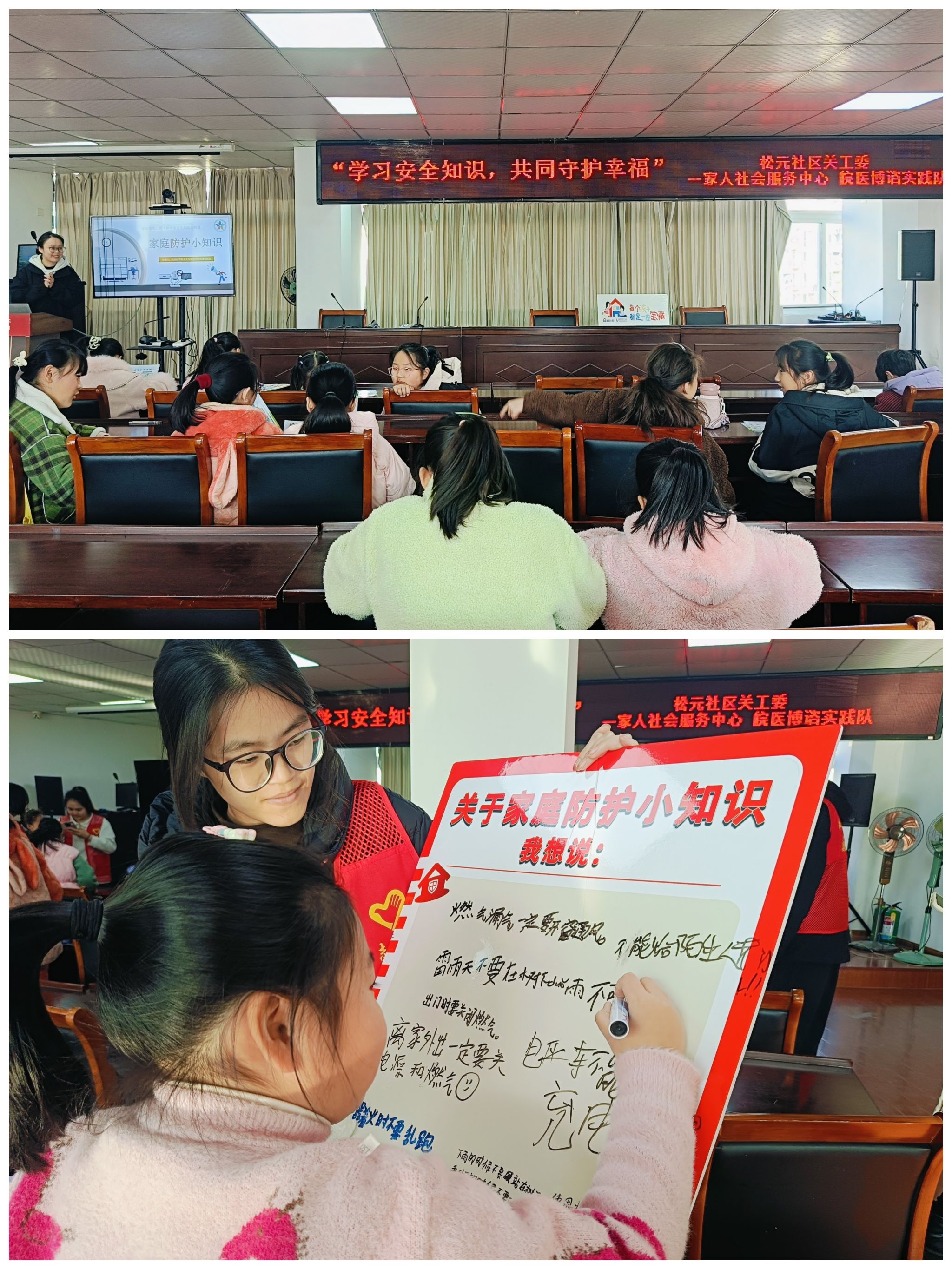 活动伊始,志愿者为小朋友们分发了儿童居家安全宣传单,并由“博谘•筑梦”队队长陈文慧进行宣讲解释,帮助孩子们了解到了更多的居家安全知识。随后,志愿者协助小朋友们在留言板上写下自己学到的安全知识以及感想。