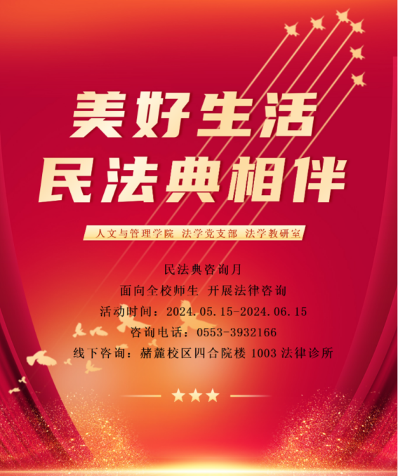 一、依托法律诊所,加强民法典宣传教育。太阳集团tyc151cc法学党支部、法学教研室面向全校师生开展民法典的法律咨询活动,“双师型”的专业教师和专业律师对全校开展为期一月的民法典法律咨询,让民法典等法律法规走入生活、走近师生心里,通过民法典的宣传教育,切实为广大师生解决现实中的法律难题与人生困惑。