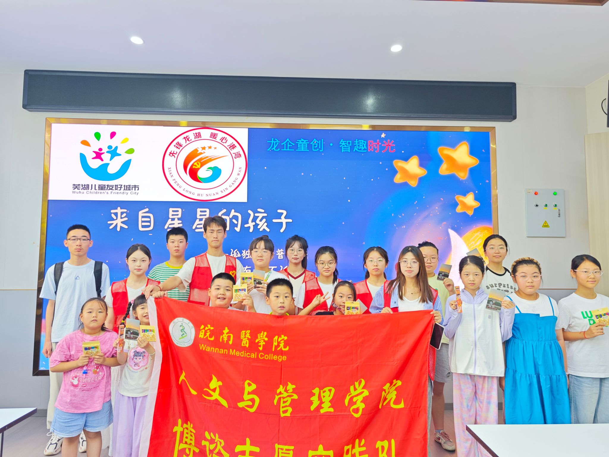 启理解之窗,温情互动架起“星空桥梁”。7月7日,实践队温情开启孤独症科普之旅。活动现场童趣盎然,队员们转变为“科普小老师”,借助卡通PPT与温馨动画,将孤独症儿童喻为“来自星星的孩子”,形象诠释其独特的交流方式与兴趣世界。在热烈讨论中,理解与包容的桥梁悄然筑起。“原来他们不是不理人,是需要我们用特别的方式交朋友!”孩子们质朴的感悟,检验了活动成功播下的善意。