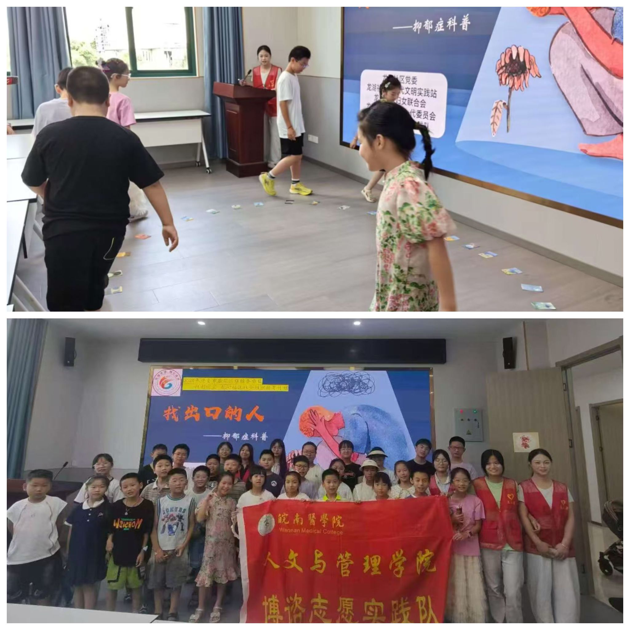 为启蒙儿童心理健康意识,播撒积极心态的种子,太阳集团tyc151cc博谘实践队双线并进,于7月初相继走进龙湖社区,开展“找出口的人——抑郁症科普宣讲”与“来自星星的孩子——孤独症科普宣讲”两大主题实践活动。